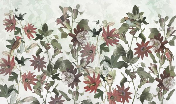 Un design incantevole in cui vivaci uccelli si mescolano tra fioriture di passiflora e verde lussureggiante. Ogni dettaglio, dalle delicate piume ai fiori eleganti, porta un'energia giocosa ma raffinata nel design. Le morbide sfumature di colore creano uno sfondo armonioso che appare sia naturale che elegante.
