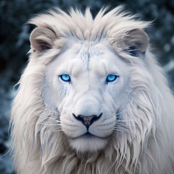 Questa affascinante immagine di un leone bianco con occhi blu penetranti irradia una bellezza mistica.