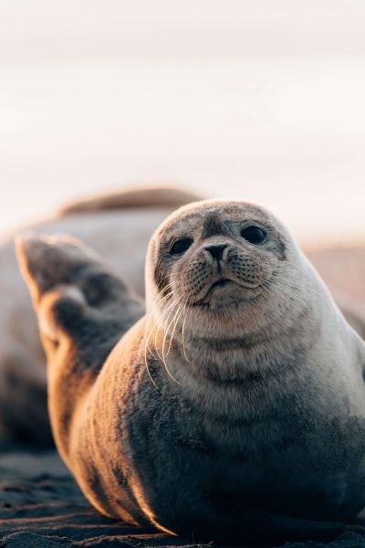 Carta da parati fotografica di una foca sulla spiaggia alla luce della sera. Da abbinare alla camera da letto.