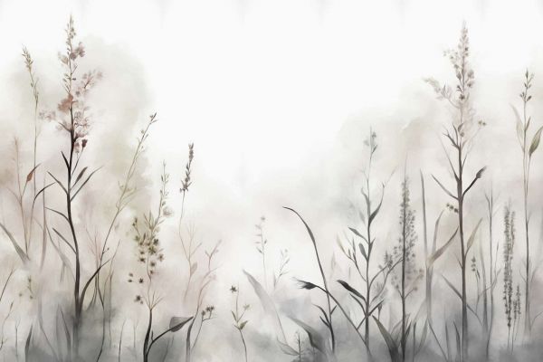 Graminacee selvatiche e fiori in toni grigi neutri creano un aspetto minimalista e raffinato. La tecnica dell'acquerello conferisce al design un'atmosfera morbida e sognante, ideale per un interno sobrio e stiloso.