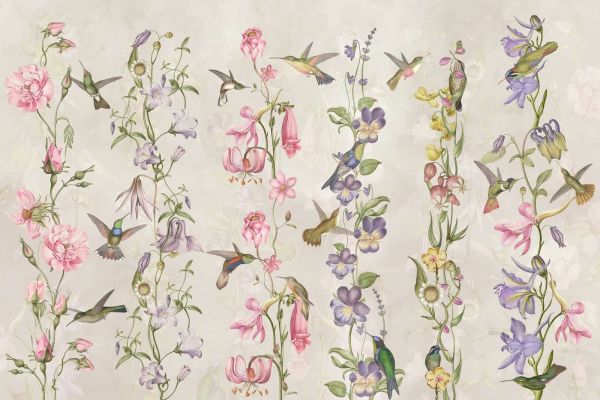 Un motivo elegante di fiori selvatici in tonalità tenui, incorniciato da colibrì danzanti. I dettagli raffinati e i colori pastello creano un'atmosfera rilassante e romantica che si adatta perfettamente a qualsiasi ambiente.