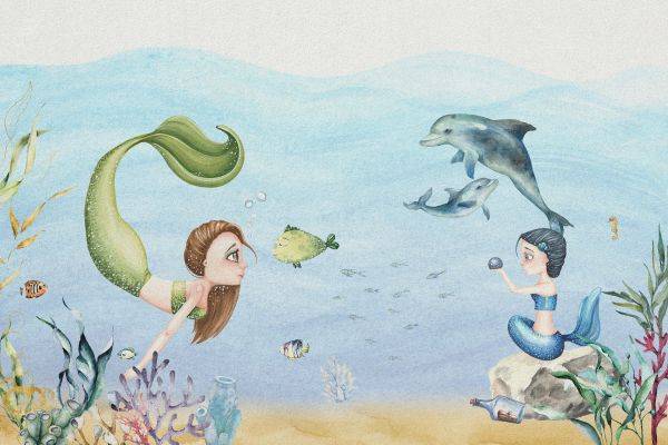 Belle sirene in un colorato mondo sottomarino. Delfini, un cavalluccio marino e altri animali tengono compagnia alle sirene!