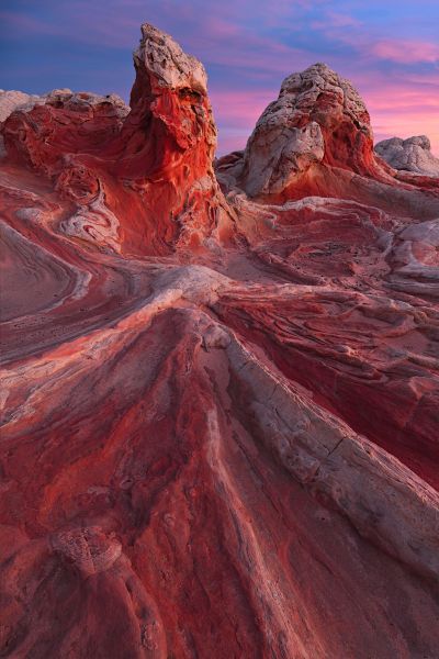 Paesaggio montano di colore marrone rossastro con un bel cielo colorato al tramonto.