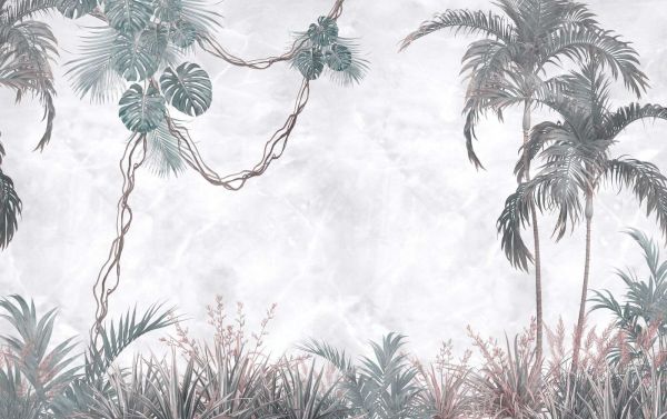 Un design tropicale raffinato con palme eleganti, vegetazione lussureggiante e liane pendenti, realizzato in morbide tonalità pastello e verde-grigio. Lo sfondo chiaro, simile al marmo, conferisce un aspetto fresco e sognante. Questo design emana calma ed eleganza, perfetto per un'atmosfera serena e naturale.
