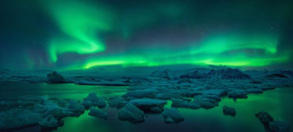 L'aurora boreale sopra un paesaggio di ghiaccio in Norvegia.