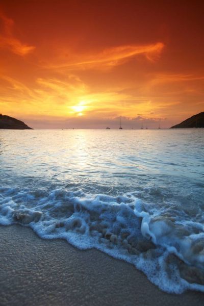 Carta da parati con una spiaggia blu brillante e il tramonto sullo sfondo