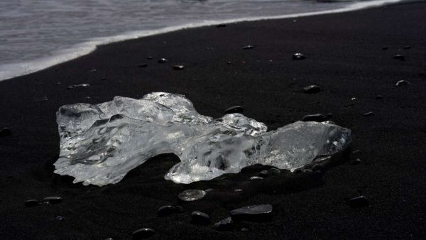 Un pezzo di ghiaccio cristallino giace immobile su una costa di sabbia lavica nera profonda, circondato da ciottoli bagnati. Le onde spumeggianti sullo sfondo sottolineano il contrasto tra il freddo e il calore vulcanico.