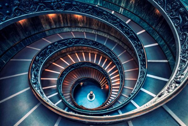 Questo affascinante progetto immerge lo spazio in un vortice visivo di eleganza e simmetria. La forma a spirale, ispirata a una monumentale scalinata a chiocciola, cattura immediatamente l'attenzione e dà una forte sensazione di movimento e profondità. L'uso dei colori è particolarmente armonioso: tonalità fredde come blu notte e grigio acciaio vengono riscaldate da accenti di rame e da una morbida luce ambrata, donando all'insieme un aspetto atmosferico, quasi cinematografico. La balaustrata ornata riccamente con ornamenti barocchi aggiunge un tocco classico, mentre la ripetizione geometrica delle linee crea un ritmo moderno, quasi futuristico. Questa combinazione rende il progetto estremamente adatto sia agli interni moderni sia agli stili di arredamento classico-eclettici, dove può fungere da potente punto focale visivo. In una ambientazione moderna questo design si presta magnificamente a essere abbinato a mobili minimalisti in nero, ottone o legno scuro, e accessori in vetro fumé o pelle. Per un look più classico si può pensare a tessuti in velluto, illuminazione vintage e accenti dorati che esaltano i dettagli color rame. Ideale per ambienti dove è desiderato un impatto: un soggiorno elegante, una biblioteca domestica artistica, un ufficio domestico ispiratore o anche un ingresso lussuoso. Il movimento a spirale invita alla contemplazione e rende ogni ambiente più ampio e dinamico. Il motivo respira un'eleganza senza tempo e sa unire senza sforzo romanticismo classico e raffinazione contemporanea, con un effetto ipnotizzante.