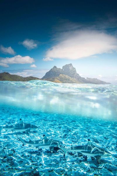 Acqua cristallina rivela un gruppo di squali di barriera che nuotano elegantemente attraverso una laguna turchese, con sullo sfondo un'isola tropicale e imponenti cime montuose.