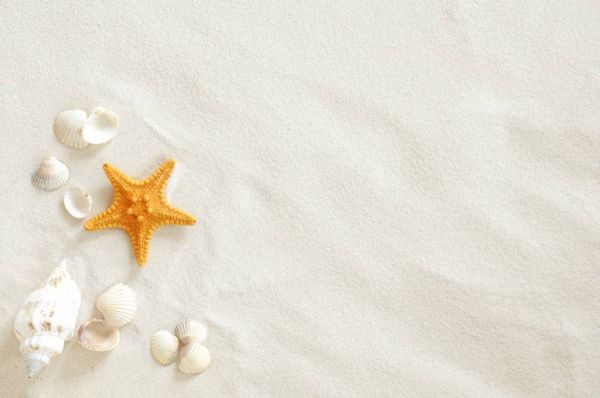 Carta da parati fotografica con sabbia bianca con una stella marina e diverse conchiglie. Crea la tua spiaggia sulla tua parete