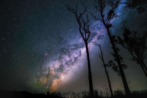 Cielo stellato colorato tra i sottili alberi.