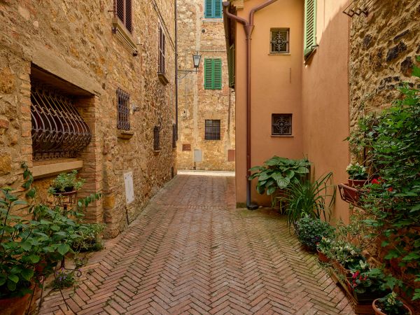 Bella strada italiana con piante e fiori in una giornata di sole. Abbinate questa carta da parati fotografica alla vostra casa per creare ancora più atmosfera.