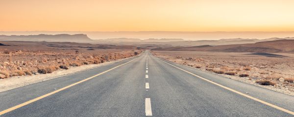 Una strada deserta e deserta in Israele. La strada sembra continuare all'infinito, scomparendo tra le montagne.