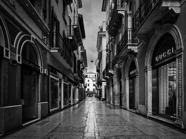 Strada dello shopping in bianco e nero. Portate più atmosfera nella vostra stanza con questa carta da parati fotografica unica.