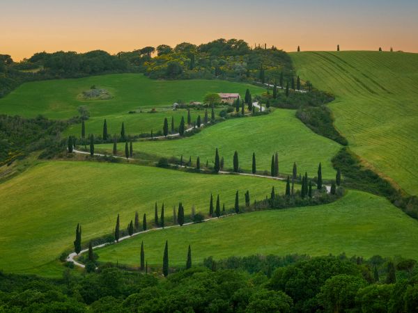 Strada tortuosa con cipressi al tramonto. Portate un po' di Italia nella vostra casa con questa carta da parati fotografica.