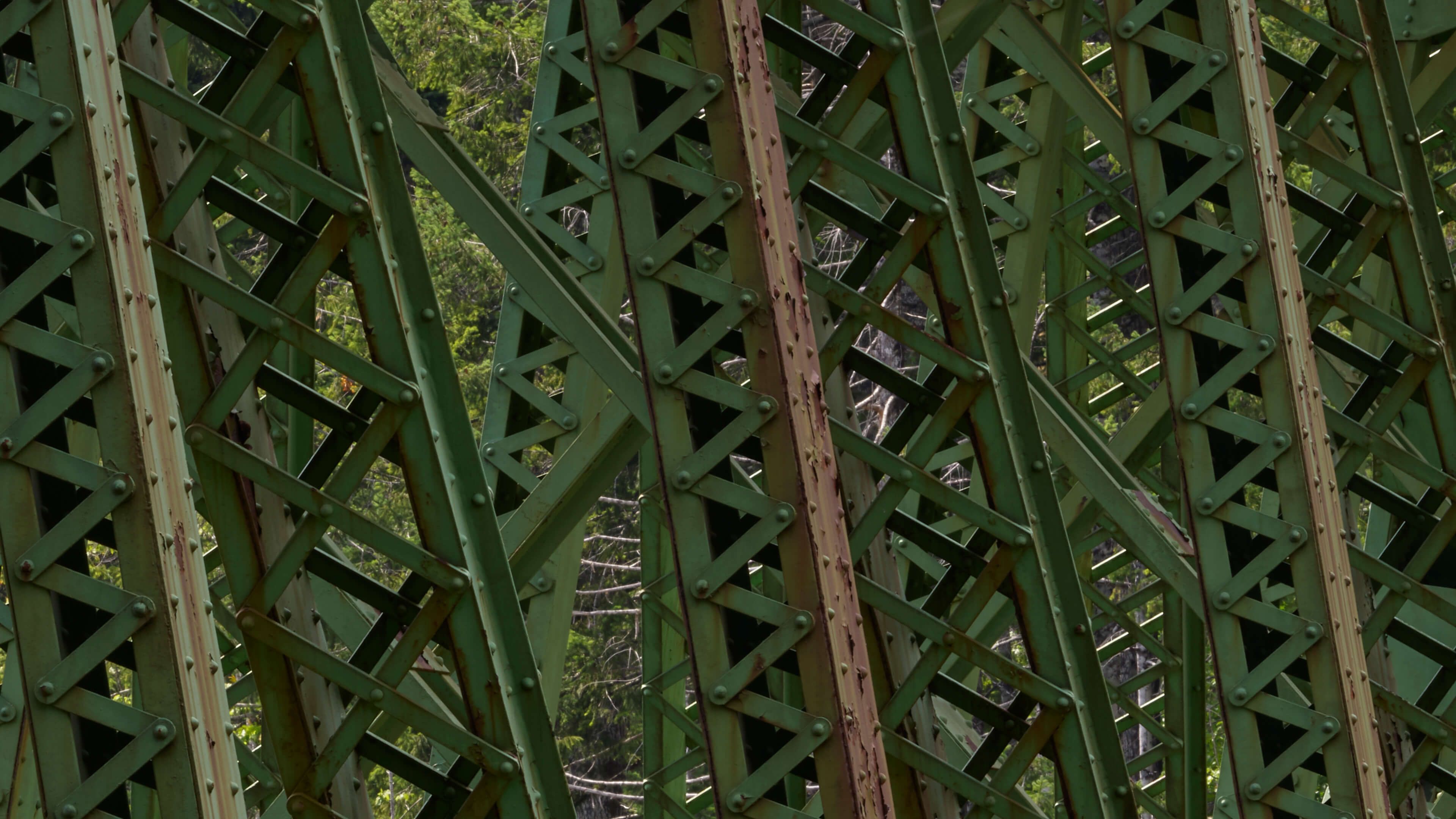 Costruzione in acciaio verde di un vecchio ponte ferroviario con rivetti dettagliati