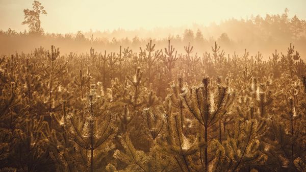 L'alba su una giovane pineta. La foto è stata scattata durante una bella mattina d'autunno. Si può notare come il sole nascente aggiunga vita e risvegli la natura dopo una notte fredda.