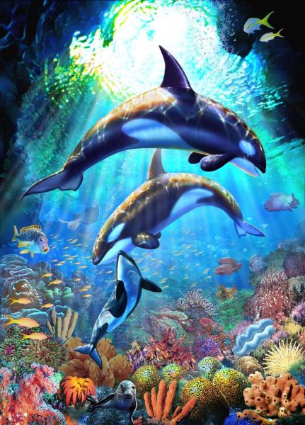 Un affascinante paesaggio sottomarino con eleganti orche e colorati coralli, illuminato da raggi di sole brillanti. Questo design combina tonalità di blu profondo con colori vivaci della vita marina, creando un'atmosfera serena e incantevole che porta in vita la magia dell'oceano.