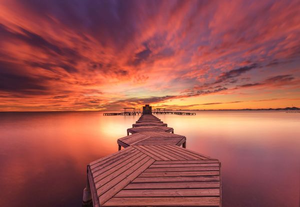 Alba alle terme su sfondo fotografico. Un bellissimo e colorato tramonto su un bel molo.