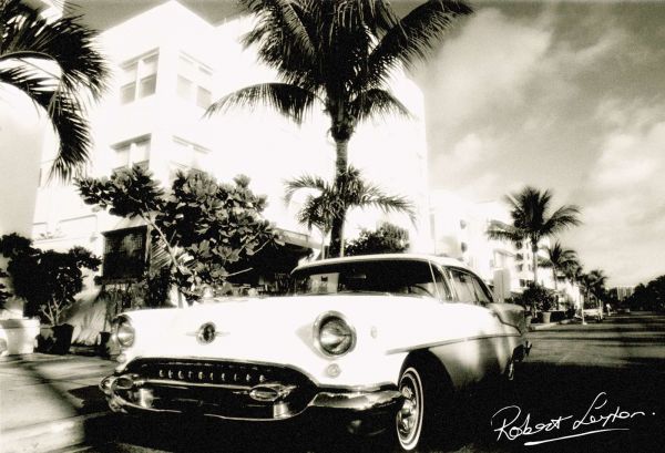 Un'immagine in bianco e nero suggestiva di un'auto classica, incorniciata da palme tropicali e architettura in stile retrò. La composizione emana un fascino senza tempo e nostalgia.