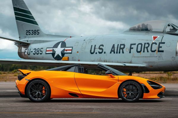 Una vivace cabriolet sportiva arancione parcheggiata di fronte a un iconico aereo da combattimento dell'U.S. Air Force. Le linee potenti e le forme aerodinamiche di entrambe le macchine emanano velocità e forza. Un impressionante contrasto tra lusso e precisione militare.