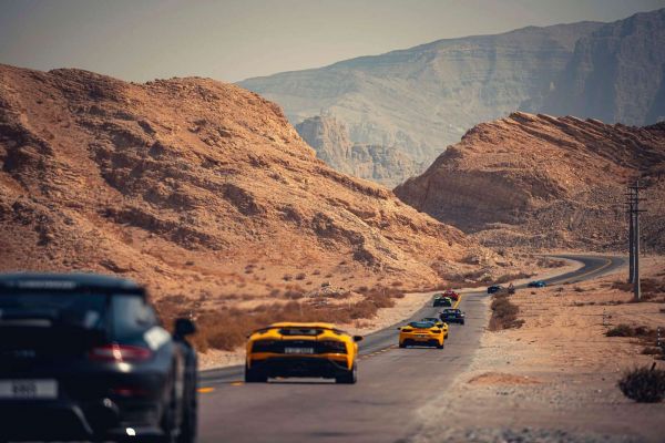 Una impressionante colonna di supercar sfreccia lungo una tortuosa strada nel deserto, circondata da formazioni rocciose e paesaggi montuosi senza fine. I colori vivaci delle auto contrastano splendidamente con le calde tonalità terrose del terreno secco. Un'immagine di velocità, lusso e avventura.