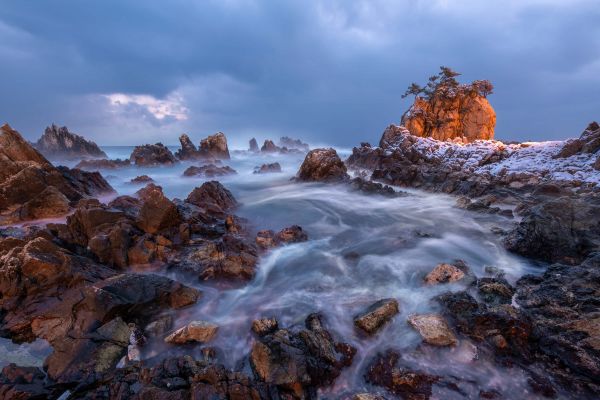 Acqua che scorre tra le rocce. Sullo sfondo si può vedere una roccia con alberi che crescono attraverso di essa.