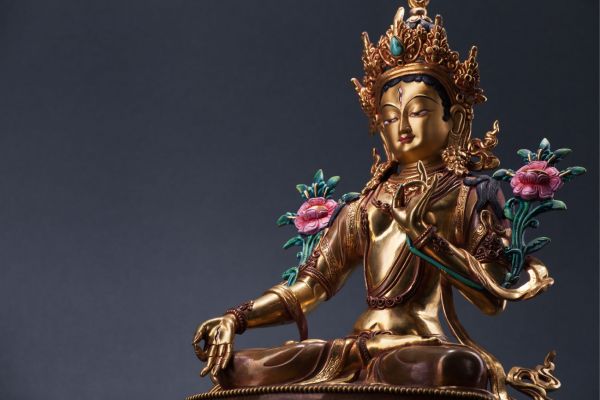 Una statua in bronzo di una Tara bianca su uno sfondo grigio.