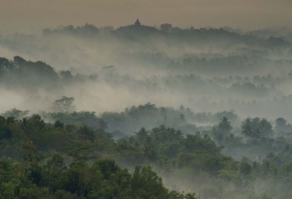 Una foresta tropicale nella nebbia con la punta del tempio in lontananza. La nebbia rende la carta da parati misteriosa.