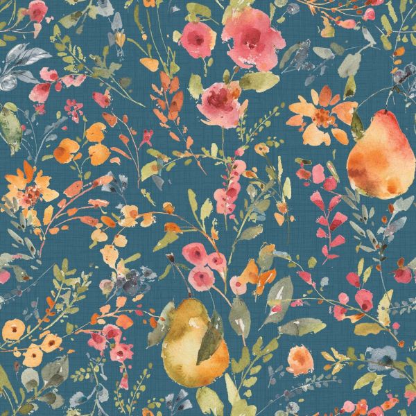 Questo design giocoso e vivace porta in vita un'abbondanza di fiori estivi, con allegre illustrazioni ad acquerello di fiori di campo in tonalità calde come rosa pesca, arancione e giallo tenue. Tra il verde fiorito compaiono pere realistiche, dipinte in sfumature calde di giallo-verde, che danno al design un accento inaspettato e affascinante. Lo sfondo blu-verde profondo crea un contrasto potente e fa risaltare magnificamente i colori. Questo design si adatta perfettamente a un interno bohemien, dove elementi naturali, espressione artistica e accenti colorati si incontrano. Pensa a mobili in legno, tende di lino, accessori in rattan e molte piante da interno. Anche in uno stile country questo design si adatta bene, con tonalità pastello morbide, mobili d'epoca e un'atmosfera leggera e rustica. Per un aspetto armonioso, combina questo motivo con legni chiari, tessuti color crema e accessori in tonalità terrose come terracotta o verde oliva. Un tappeto verde scuro o giallo senape può bilanciare bene l'insieme. La combinazione giocosa di forme naturali e colori ricchi rende questo design estremamente adatto per spazi dove si desidera portare vivacità e calore, come una cucina, sala da pranzo o cameretta. Anche in un ufficio domestico fornisce ispirazione e un'atmosfera creativa. L'effetto a griglia sottile sullo sfondo conferisce inoltre un tocco moderno, senza compromettere l'aspetto morbido e dipinto a mano.