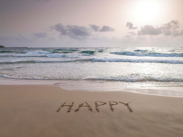 Testo nella sabbia su una spiaggia tranquilla. Sulla sabbia c'è scritto ''Happy''.