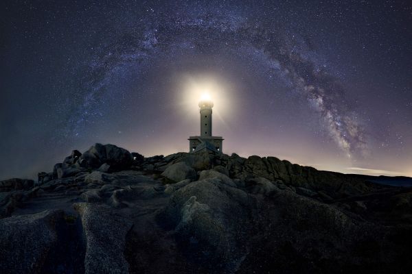Sfondo fotografico di un faro luminoso di notte sotto un bellissimo cielo stellato.
