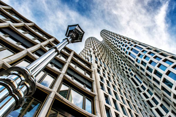Una foto in prospettiva di rana di un edificio artistico disegnato con linee ondulate.