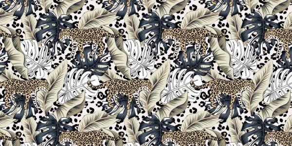Leopardo circondato da foglie di banana e di palma con un motivo leopardato sullo sfondo.