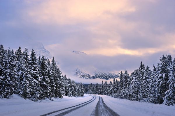 Un'autostrada tra splendidi alberi innevati. Le montagne sono visibili anche attraverso le nuvole.