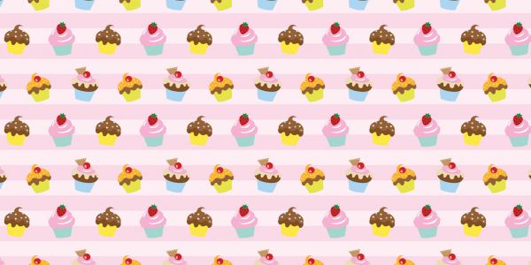Carta da parati fotografica con diversi tipi di cupcake su sfondo rosa a righe