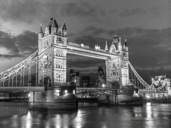 Questa fotografia cattura il Tower Bridge in un momento di silenzio, dove i suoi contorni illuminati si stagliano contro il cielo serale. Il riflesso nell'acqua raddoppia la maestosità di questa struttura, mentre sullo sfondo lo skyline contemporaneo è un sottile promemoria del suo incessante progresso. La combinazione di colori monocromatici accentua il senso di maestosità e continuità.