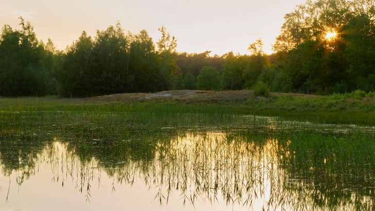 Tramonto al bosco in una zona verde e tranquilla con rami a strapiombo