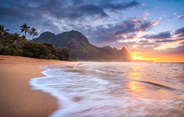 Un tramonto colorato si riflette nelle onde lungo una spiaggia tropicale, circondata da palme e montagne lussureggianti. La luce calda e le onde calme creano un'atmosfera sognante e rilassante.