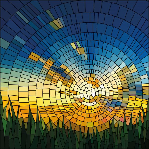 Un tramonto su un prato in stile mosaico. Combina questa carta da parati fotografica nella tua casa e completa la stanza.