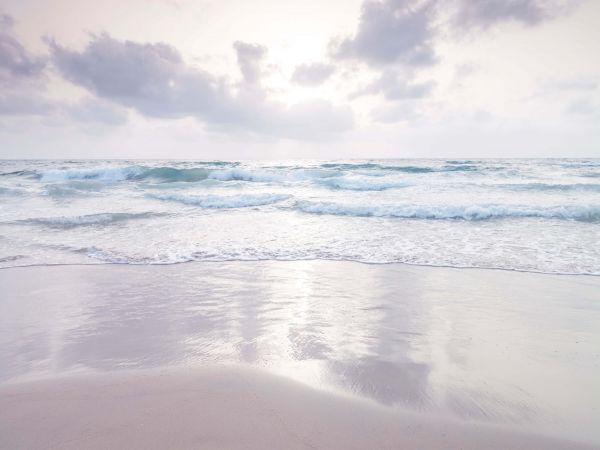 Spiaggia tranquilla con onde alte durante una giornata nuvolosa. Combinate questa carta da parati fotografica nello studio, ad esempio.