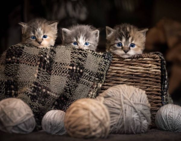 Tre dolci gattini in un cestino su carta da parati fotografica. Bellissimi colori caldi e palline di lana in primo piano per giocare con i gattini.