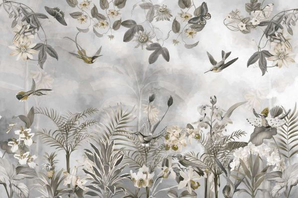 Este diseño captura la esencia de un paraíso tropical, donde la belleza natural y la serenidad se unen. Flores exóticas como orquídeas y maracuyá florecen entre exuberantes palmeras y diversas hojas verdes. Los colibríes flotan graciosamente por el aire, rodeados de sutiles mariposas que bailan delicadamente entre las flores. La combinación de colores, compuesta por suaves tonos pastel y toques alegres, realza un ambiente fresco y relajado.