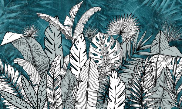 Foglie tropicali disegnate su uno sfondo di cemento color petrolio.