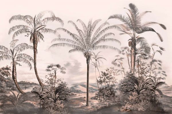 Con le sue audaci tonalità di nero e grigio, questo design forma un notevole panorama tropicale che si sente sia moderno che senza tempo. Le palme sembrano stagliarsi in silhouette contro un orizzonte sottile e crepuscolare, dando un aspetto intrigante e artistico. Questo motivo è perfetto per interni che amano i contrasti e un tocco di drammaticità. In un ambiente chic e minimalista con pareti bianche nette e accenti metallici, questo design ha l'opportunità di brillare davvero. In un contesto industriale o simile a un loft, puoi abbinarlo a cemento, pelle o legni scuri per un'atmosfera robusta e audace. I colori scuri creano un'atmosfera lussuosa e misteriosa, rendendo questo design particolarmente adatto, ad esempio, per un elegante soggiorno o una camera da letto principale. Completandolo con illuminazione calda, cuscini di velluto e alcune piante verdi, crei un insieme raffinato eppure accogliente. Così porti la notte tropicale all'interno, con tutto il fascino che ne deriva.