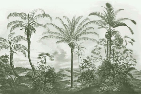 Un paesaggio tropicale vivace con tonalità di verde brillante e palme lussureggianti, alternate a morbidi colori pastello sullo sfondo. Questo design emana energia fresca e porta un'atmosfera gioiosa ed esotica.