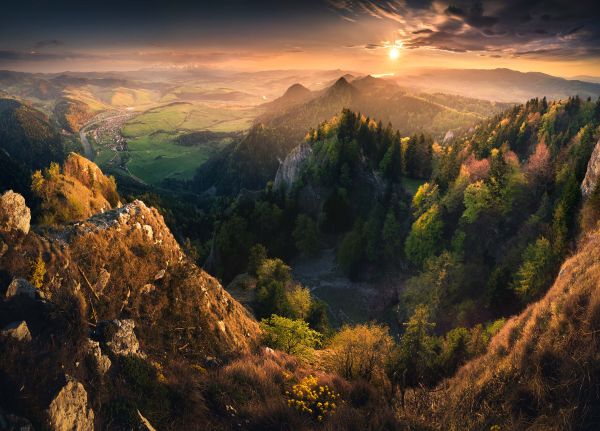 La vista da una montagna. In lontananza c'è un villaggio lungo il fiume.