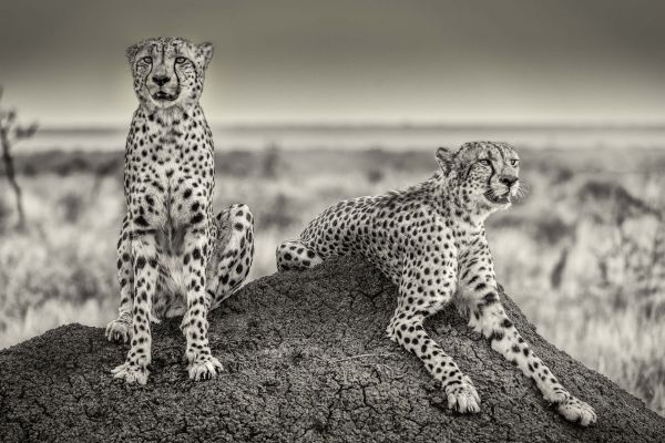 Due ghepardi che guardano fuori sullo sfondo fotografico. Con questa carta da parati nella vostra casa otterrete una bellissima atmosfera.