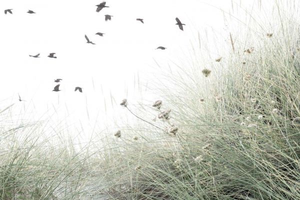 Uno stormo di uccelli vola elegantemente sopra l'erba dunosa di un verde chiaro. Le tonalità tenui e la composizione ariosa emanano calma e libertà.