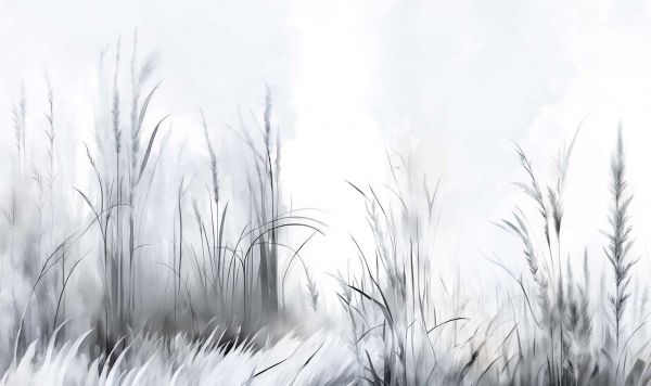 Graminacee ondeggianti in morbide tonalità di blu danzano nel vento su uno sfondo chiaro. La raffinata tecnica dell'acquerello e le sottili pennellate conferiscono al design un aspetto fresco e calmante, perfetto per un ambiente sereno e stiloso.
